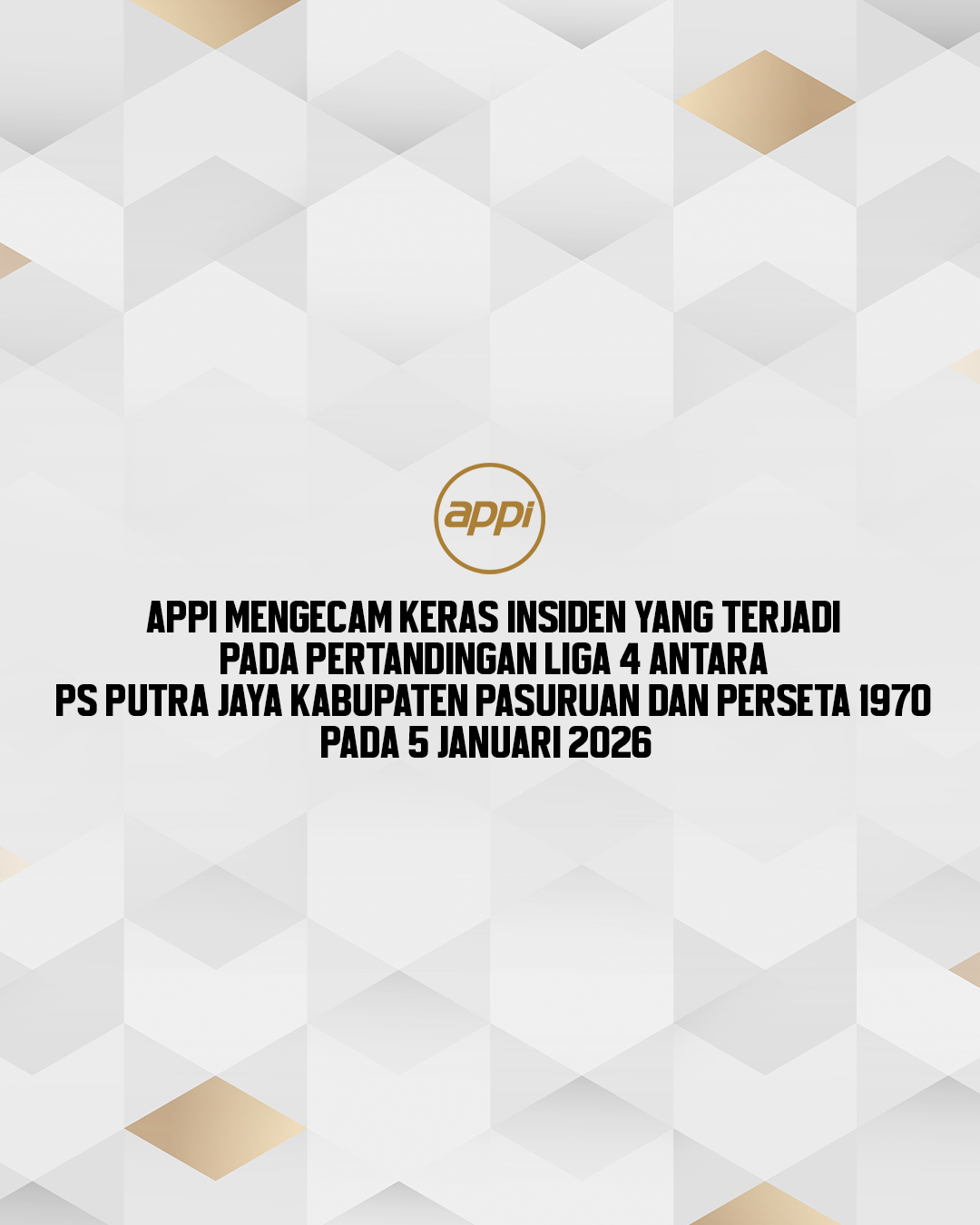 Asosiasi Pesepakbola Profesional Indonesia (APPI) mengecam keras insiden yang terjadi pada pertandingan Liga 4 antara PS Putra Jaya Kabupaten Pasuruan dan Perseta 1970, yang digelar sore hari pada tanggal 5 Januari 2026 di stadion Bangkalan.